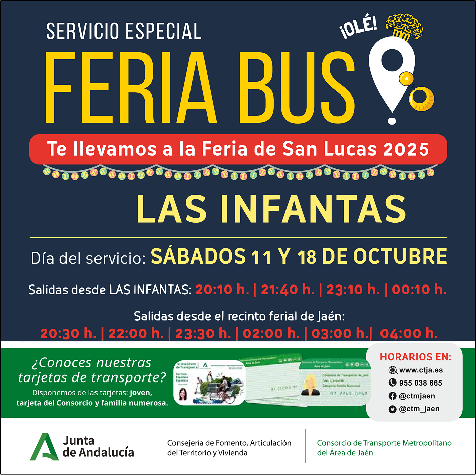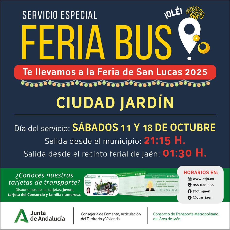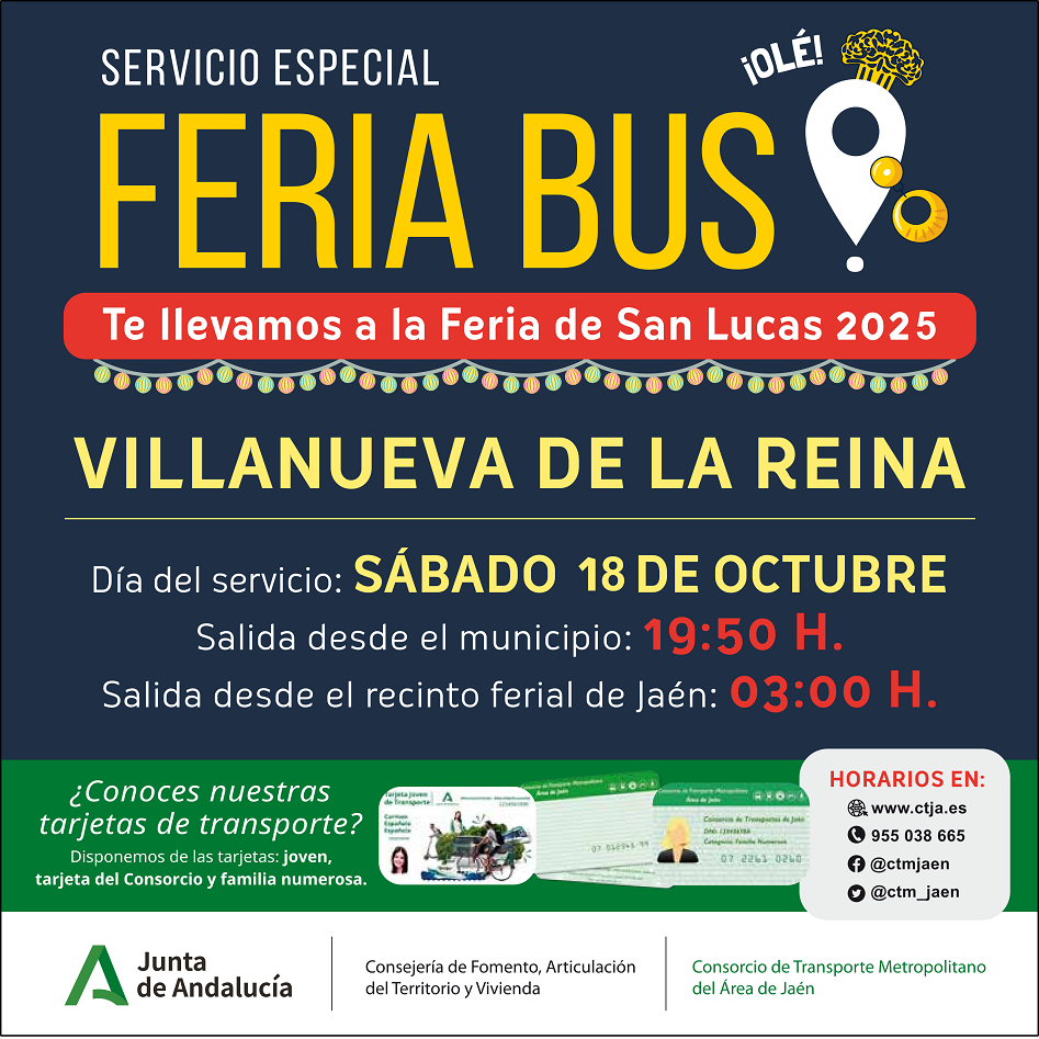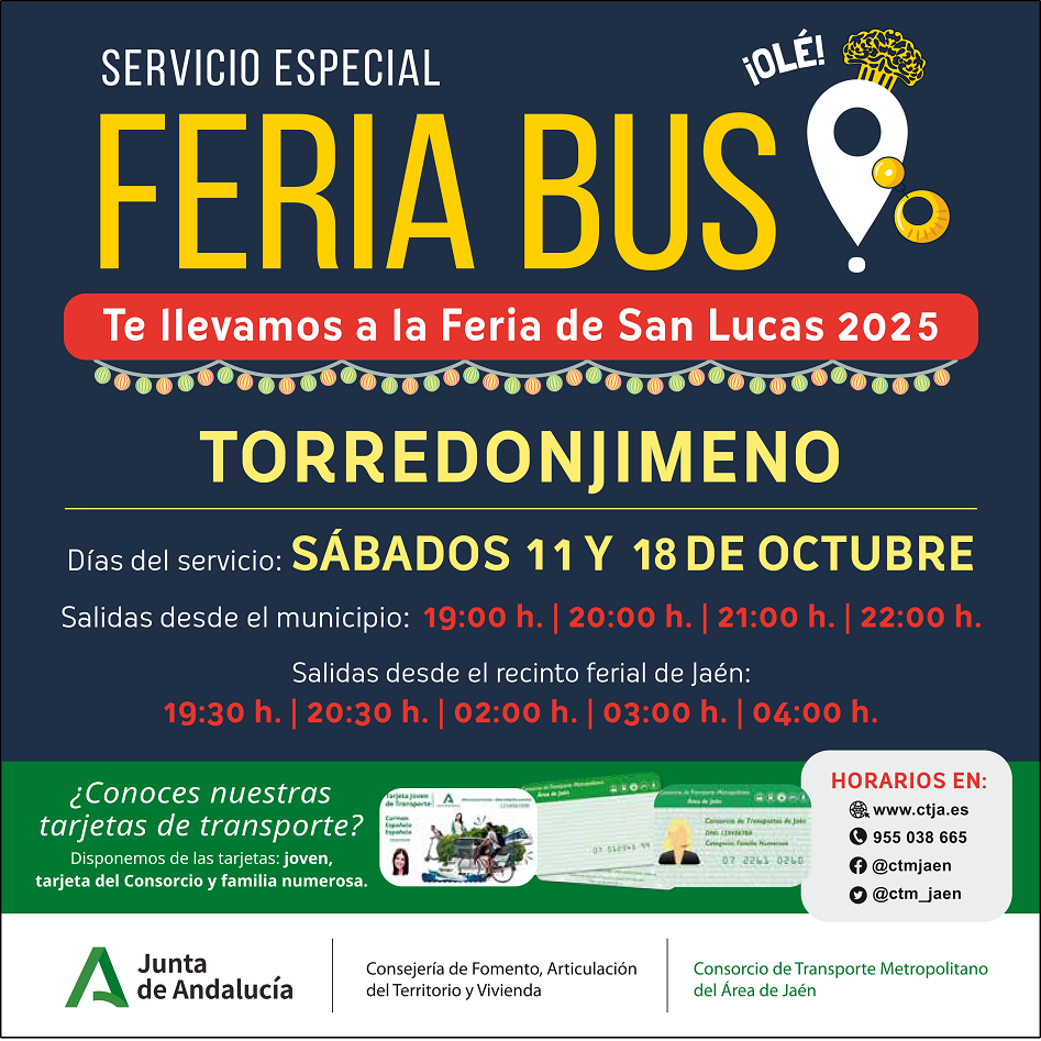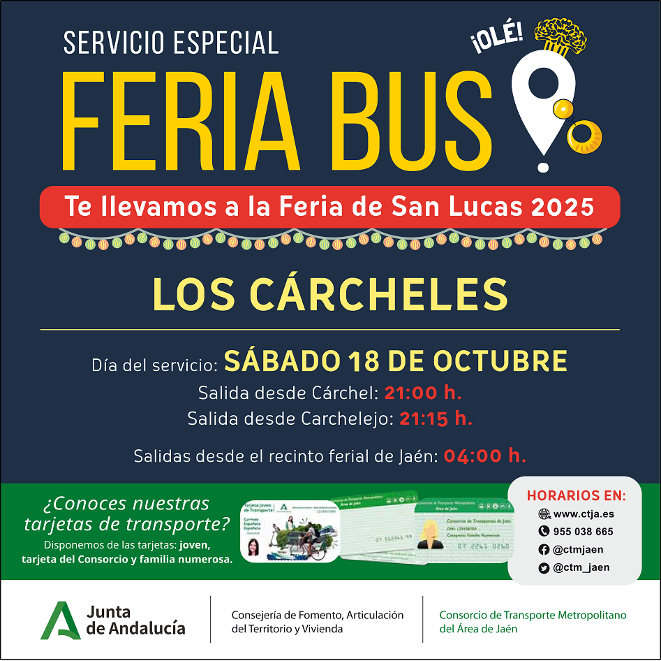 La Consejería de Fomento, Articulación del Territorio y Vivienda de la Junta de Andalucía, a través de la delegación territorial y del Consorcio de Transporte Metropolitano del Área de Jaén, va a habilitar un servicio especial de autobuses con motivo de la próxima Feria de San Lucas 2025. El delegado territorial, Miguel Contreras, ha dado a conocer este dispositivo junto al gerente del Consorcio de Transporte Metropolitano del Área de Jaén, Sergio López, destacando que se trata de “un servicio que tiene una gran acogida entre la ciudadanía del entorno metropolitano de la capital y que, además, ofrece la posibilidad de ir a la feria con seguridad en los desplazamientos a través del transporte público, relajando los embotellamientos y evitando la saturación de los aparcamientos habilitados”.