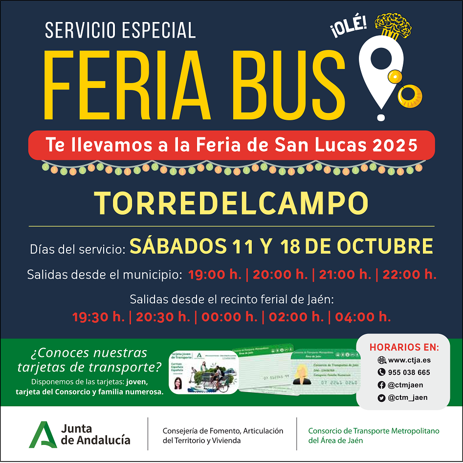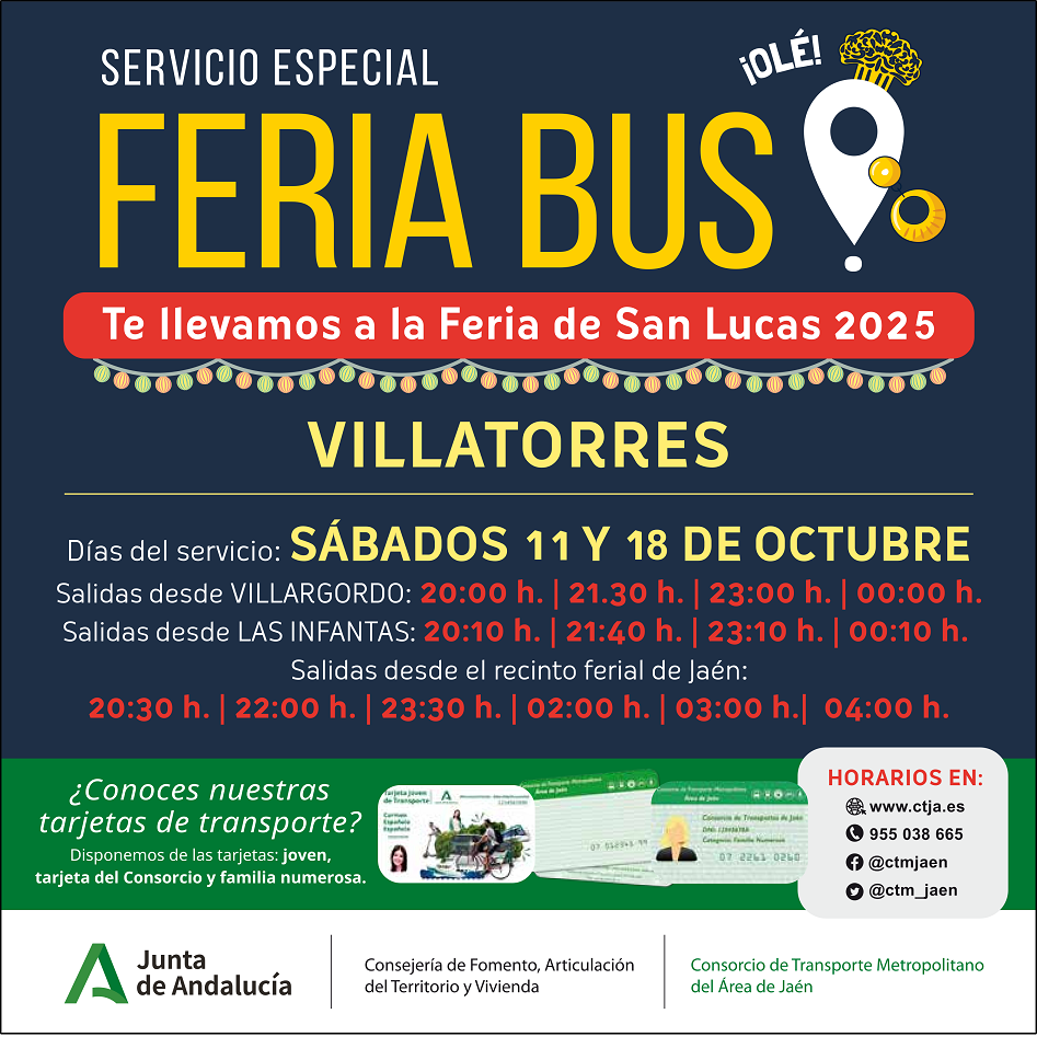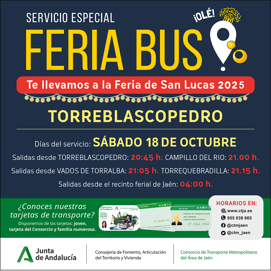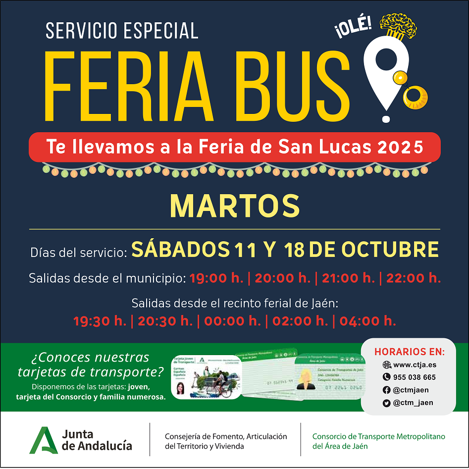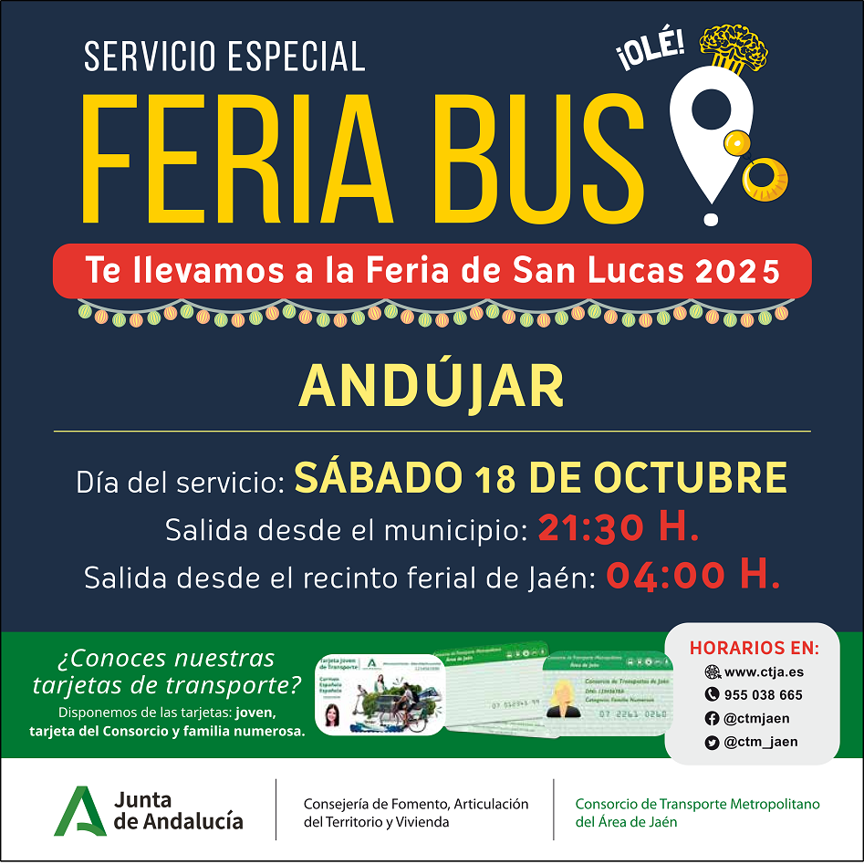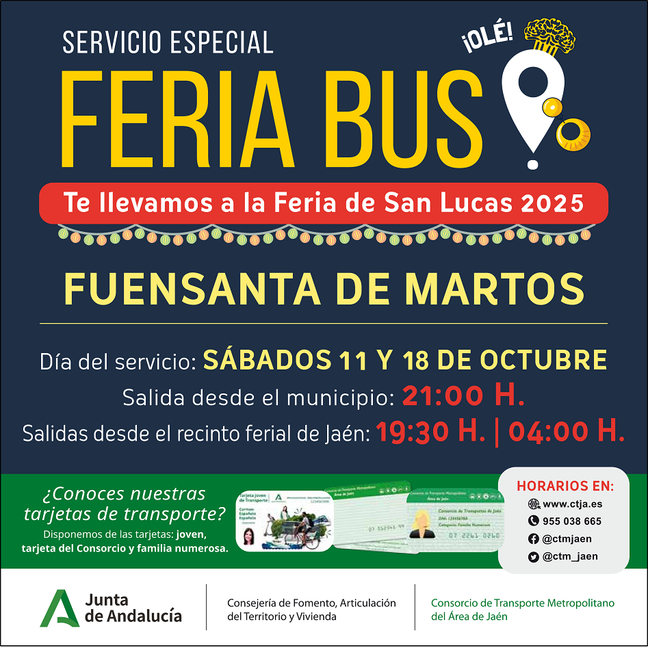 La Consejería de Fomento, Articulación del Territorio y Vivienda de la Junta de Andalucía, a través de la delegación territorial y del Consorcio de Transporte Metropolitano del Área de Jaén, va a habilitar un servicio especial de autobuses con motivo de la próxima Feria de San Lucas 2025. El delegado territorial, Miguel Contreras, ha dado a conocer este dispositivo junto al gerente del Consorcio de Transporte Metropolitano del Área de Jaén, Sergio López, destacando que se trata de “un servicio que tiene una gran acogida entre la ciudadanía del entorno metropolitano de la capital y que, además, ofrece la posibilidad de ir a la feria con seguridad en los desplazamientos a través del transporte público, relajando los embotellamientos y evitando la saturación de los aparcamientos habilitados”.