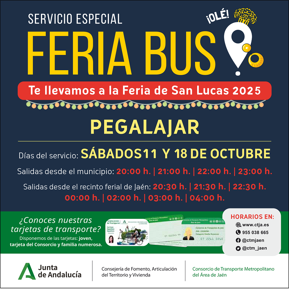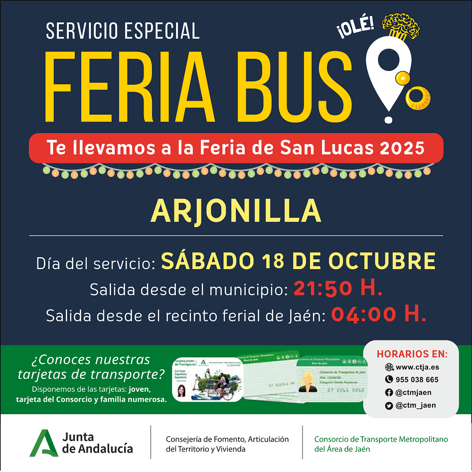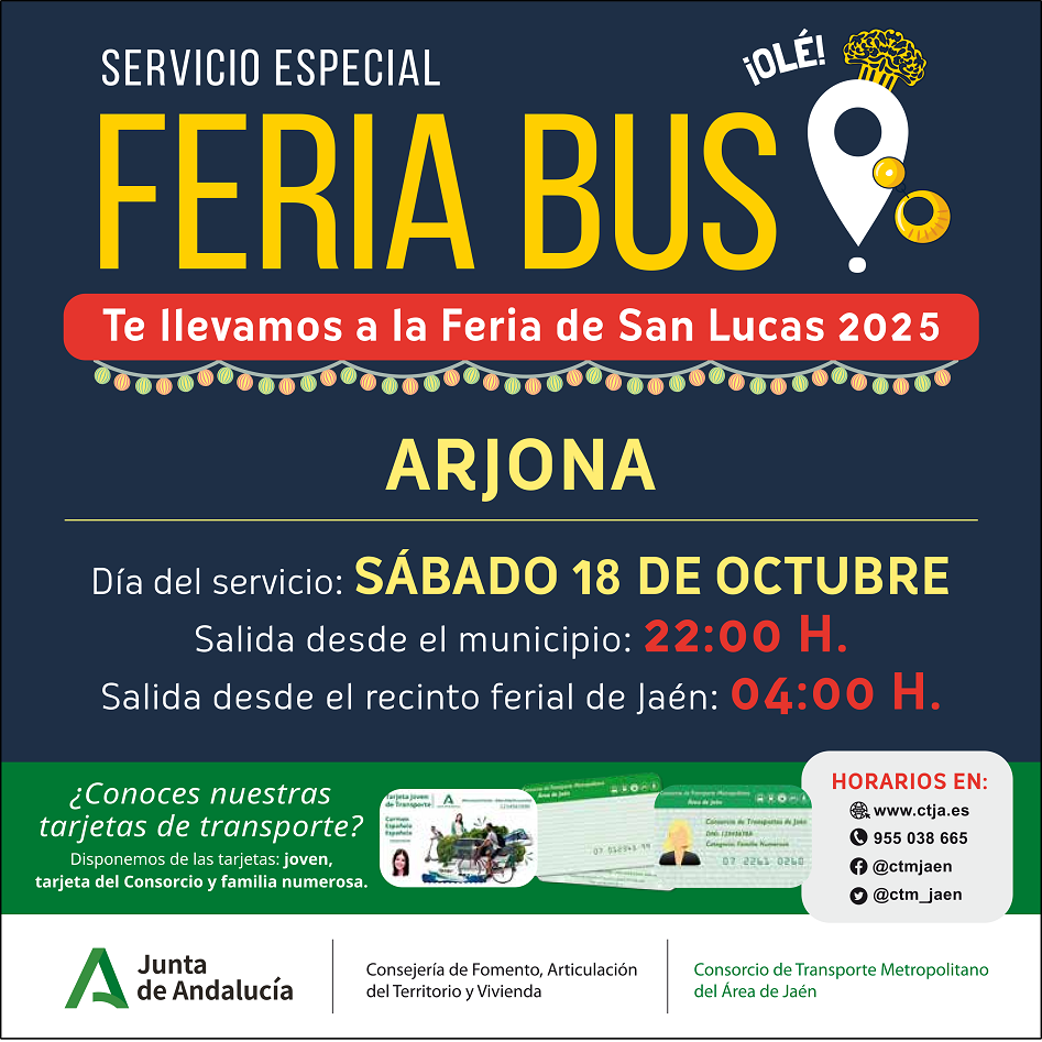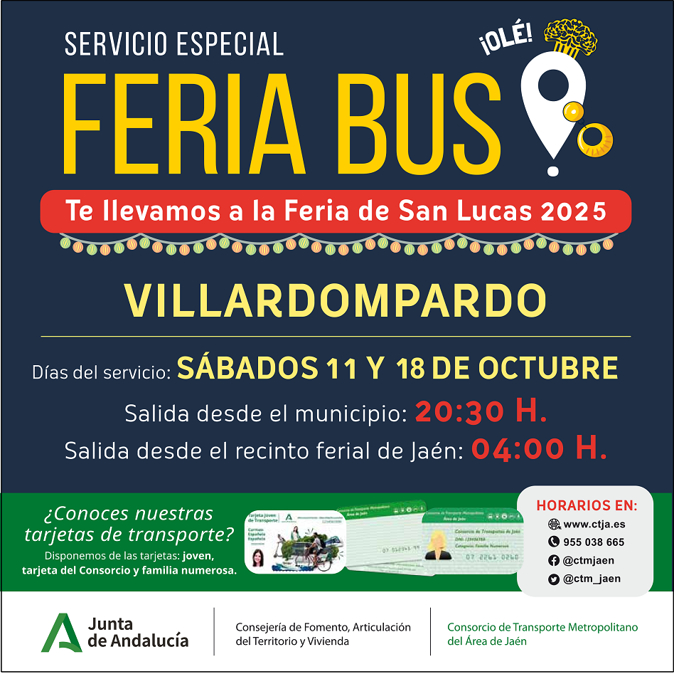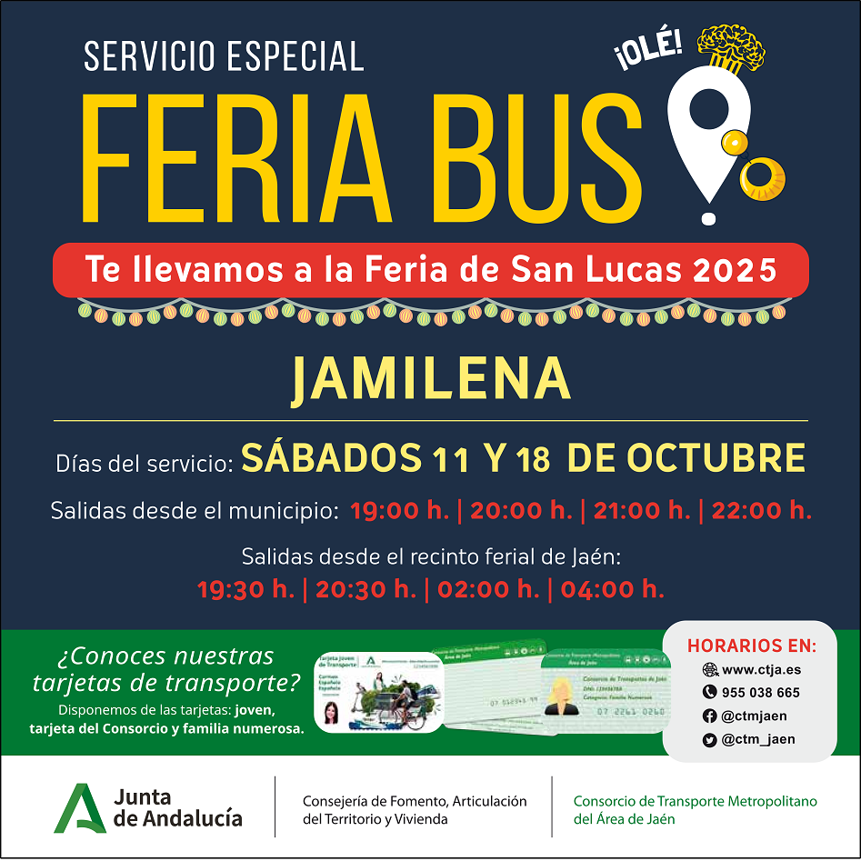 La Consejería de Fomento, Articulación del Territorio y Vivienda de la Junta de Andalucía, a través de la delegación territorial y del Consorcio de Transporte Metropolitano del Área de Jaén, va a habilitar un servicio especial de autobuses con motivo de la próxima Feria de San Lucas 2025. El delegado territorial, Miguel Contreras, ha dado a conocer este dispositivo junto al gerente del Consorcio de Transporte Metropolitano del Área de Jaén, Sergio López, destacando que se trata de “un servicio que tiene una gran acogida entre la ciudadanía del entorno metropolitano de la capital y que, además, ofrece la posibilidad de ir a la feria con seguridad en los desplazamientos a través del transporte público, relajando los embotellamientos y evitando la saturación de los aparcamientos habilitados”.